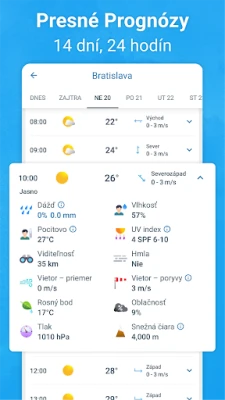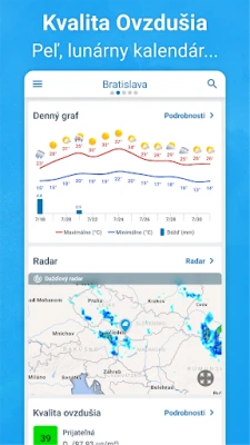 Prijímajte spoľahlivé oficiálne výstrahy od Slovenského Hydrometeorologického Ústavu (SHMÚ) v reálnom čase, priamo do vášho telefónu. Od búrok a silného dažďa až po extrémne teploty, silný vietor či dokonca hurikány a tropické búrky – budete informovaní o každom vážnom meteorologickom jave. Okrem aktuálneho stavu získate podrobnú predpoveď na nasledujúcich 14 dní s hodinovými údajmi, ktoré zahŕňajú tlak vzduchu, teplotu, smer a rýchlosť vetra, množstvo zrážok, pocitovú teplotu, vlhkosť, UV index, časy východu a západu slnka či dokonca fázy mesiaca. Prezrite si aj kvalitu ovzdušia a hladinu peľu vo vašej oblasti, a otočením telefónu sledujte teplotné trendy na intuitívnych grafoch.