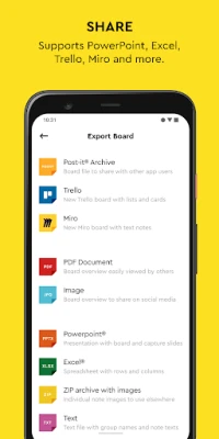 Post-it® App je viac než len digitálny zápisník; je to výkonný nástroj na spoluprácu a integráciu. Zdieľajte svoje dosky s nápadmi s kolegami na pracovných stretnutiach alebo s priateľmi pri plánovaní, čím zabezpečíte, že všetci sú na rovnakej vlne. Vďaka inteligentnému rozpoznávaniu rukopisu sú vaše poznámky automaticky prepísané do textu, čo uľahčuje vyhľadávanie a export. Použite rozsiahle editačné nástroje na kreslenie, mazanie, písanie a zmenu farby poznámok. Zoskupujte svoje nápady podľa témy alebo ich usporiadajte do prehľadnej mriežky. A pre tých, ktorí potrebujú svoje poznámky ďalej spracovať, aplikácia ponúka možnosť exportu do širokej škály formátov a cloudových služieb, vrátane Miro, Trello, Dropbox, PowerPoint, Excel a PDF, čím sa zabezpečí bezproblémová kontinuita vašej práce. Pre okamžitý prístup umiestnite kľúčové poznámky priamo na plochu vášho zariadenia pomocou praktického widgetu.